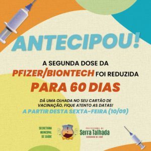 A Prefeitura de Serra Talhada, por meio da Secretaria Municipal de Saúde, inicia nesta sexta-feira (10) a redução de 90 para 60 dias do intervalo de aplicação entre as duas doses da vacina contra Covid-19 da Pfizer/BioNTech.