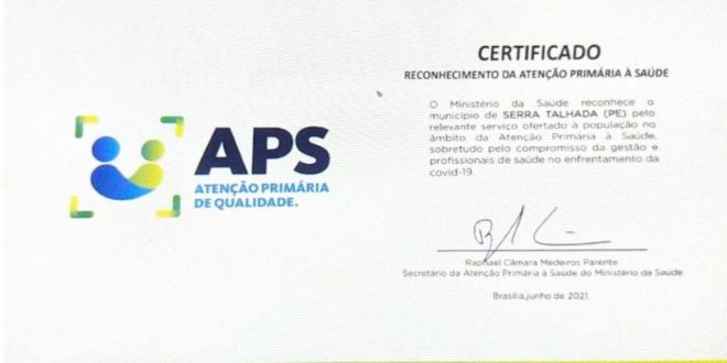 O município de Serra Talhada está entre os 6 municípios do Estado de Pernambuco que receberam do Ministério da saúde o Selo APS – Atenção Primária de Qualidade, pelos relevantes serviços ofertados à população no âmbito da Atenção Primária à saúde e sobretudo pelo compromisso da gestão e profissionais de saúde no enfrentamento à pandemia da COVID-19. Serra Talhada é a única cidade premiada com o selo na XI Geres.