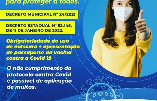 Pode ser uma imagem de 1 pessoa, em pé e texto que diz "MÁSCARA NO ROSTO E MÃO NA CONSCIÊNCIA Para lhe proteger, para proteger a todos. DECRETO MUNICIPAL N° 24/2021 DECRETO ESTADUAL N° 52.145, DE 11 DE JANEIRO DE 2022. Obrigatoriedade do uso de máscara apresentação de passaporte da vacina contra a Covid 19 o não cumprimento do protocolo contra Covid é passível de aplicação de multas. selo inicer 前 2017 PREFEITURA DE TRIUNFO MAIS TRABAL H10 NOUAS CONQUISTAS"