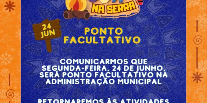 Informamos a todos os triunfenses que a próxima segunda-feira, dia 24 de junho, será ponto facultativo na Prefeitura de Triunfo. As atividades estarão suspensas, retornando normalmente na terça-feira, dia 25 de junho.