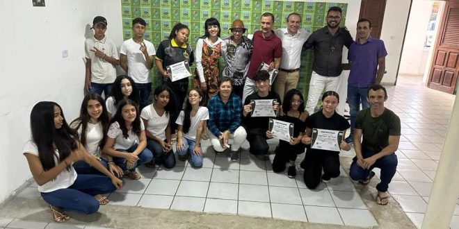 O prefeito José Irlando de Souza Lima (Irlando Parabólicas) participou na última semana, da entrega dos certificados da primeira turma do Curso de Teatro do Município de Santa Cruz da Baixa Verde. Formada por 09 alunos, O Grupo Teatral Santa-Cruzense (GRUTESC), teve inicialmente à frente o professor Carlos Sett, porém acabou deixando a turma, por problemas de saúde. Mas sua luta não foi em vão, seu trabalho foi reconhecido, o mesmo recebeu durante a solenidade, uma Homenagem Especial da Diretoria de Cultura. A nova professora Bruna Flori, finalizou as aulas e também participou da entrega dos certificados. Receberam os certificados – Ana Cláudia, Carlos Manoel, Iara Kerlly, Jaqueline Viturino, Kaiara Costa, Leticia Magalhães, Maria Alves, Murilo Gomes e Raquel Silva.