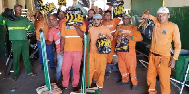A reposição dos EPIs ocorreu na antiga escola Otacílio Carlos. Foram entregues botas e luvas. Além de vassouras para varição.