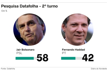 O presidenciável Jair Bolsonaro (PSL) apareceu à frente do adversário Fernando Haddad (PT) na primeira pesquisa de intenções de voto para o segundo turno, realizada pelo Instituto Datafolha, encomendada pela TV Globo e pela Folha de S. Paulo, e divulgada nesta quarta-feira (10). Bolsonaro está com 58% dos votos válidos e Haddad com 42%. Nessa contagem, não entram brancos e nulos nem os que não sabem ou não responderam. Considerando os votos totais, em que são contabilizados brancos, nulos e indecisos, Bolsonaro tem 49% das intenções de voto. Haddad aparece com 36%. Brancos e nulos somam 8%. Os que não sabem ou não quiseram opinar são 6%. A margem de erro é de dois pontos percentuais. O nível de confiança …