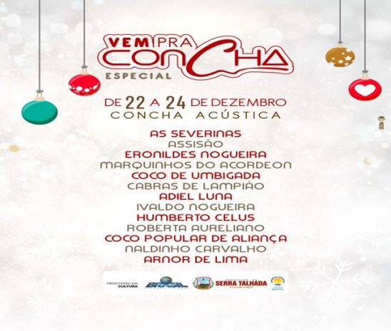 Começa neste sábado (22) e segue até a segunda-feira (24), a partir das 20h, a programação de mais uma edição do Projeto Vem Pra Concha, na Concha Acústica, em Serra Talhada.