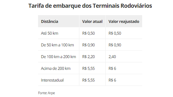O preço na tarifa sobe nos terminais rodoviários administrados pela empresa Socicam. São eles: o de Arcoverde, Caruaru, Garanhuns, Petrolina, Recife e Serra Talhada. De acordo com a Arpe, o reajuste acontece para compensar os efeitos da inflação dos períodos de 1º de outubro de 2008 a 31 de outubro de 2009; e de 1º de junho de 2016 a 30 de setembro de 2017.