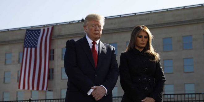 No 16° aniversário dos ataques, o primeiro de Trump na Casa Branca, o governante e sua esposa participaram do minuto de silêncio às 8h46, hora local (9h46, em Brasília), para lembrar o instante em que um primeiro avião se chocou contra uma das torres do World Trade Center de Nova York na manhã de 11 de setembro de 2001.