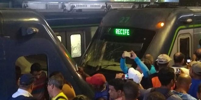 Dois trens da Linha Centro do Metrô do Recife colidiram por volta das 5h30 desta terça-feira (18), na Estação Ipiranga, no bairro de Afogados. Às 7h, o Corpo de Bombeiros informou que já havia socorrido pelo menos 30 pessoas, mas sem gravidade. Em decorrência do acidente, a Companhia Brasileira de Trens Urbanos (CBTU) paralisou todas as 15 estações da Linha Centro (Recife, Joana Bezerra, Afogados, Ipiranga, Mangueira, Santa Luzia, Werneck, Barro, Tejipió, Coqueiral, Alto do Céu, Curado, Rodoviária, Cosme e Daminhão e Camaragibe).