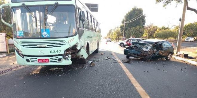 O motorista do carro ficou preso nas ferragens. O Corpo de Bombeiros está no local para fazer o resgate da vítima. Nenhum estudante que estava no ônibus ficou ferido.