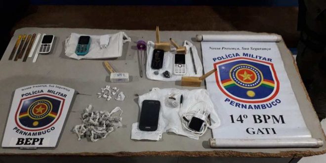 De acordo com a Polícia Militar, foram apreendidos três celulares, um carregador de celular, objetos artesanais para consumo de drogas, uma colher e porções de maconha e cocaína.