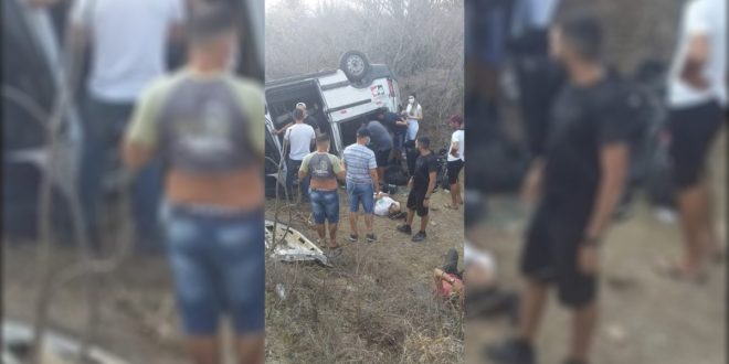 Imagens postadas nas redes sociais mostram várias pessoas ao lado da van, que capotou, e algumas deitadas no chão.