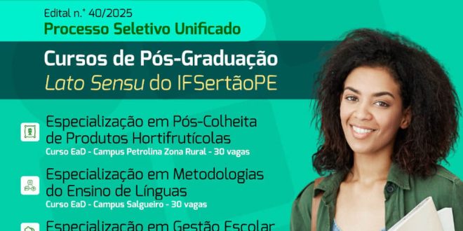 O Instituto Federal do Sertão Pernambucano (IFSertãoPE) lançou, nesta terça-feira (29) o edital n.º 40/2025, que trata do processo seletivo unificado para ingresso de estudantes em cursos de pós-graduação lato sensu oferecidos pela instituição. Ao todo, são 170 vagas disponíveis em diversos cursos de especialização gratuitos, com início previsto para o segundo semestre letivo deste ano. As inscrições para o processo seletivo estarão abertas no período de 6 de maio a 6 de junho de 2025.