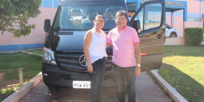 Prefeito Mário Flor e Núbia Aguiar, secretária de Saúde, receberam nesta sexta feira (14) uma Sprinter 0km com 21 lugares, para transportar os pacientes que fazem tratamento fora do domicílio.