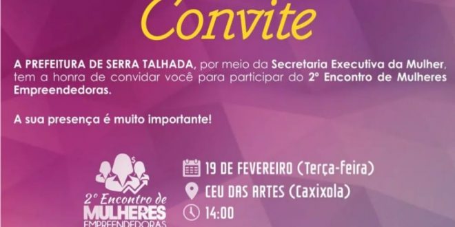 A Prefeitura de Serra Talhada, por meio da Secretaria Executiva da Mulher, realizará o 2º Encontro de Mulheres Empreendedoras. O evento acontecerá na próxima terça-feira (19.02), às 14h, no CEU das Artes, na Caxixola.