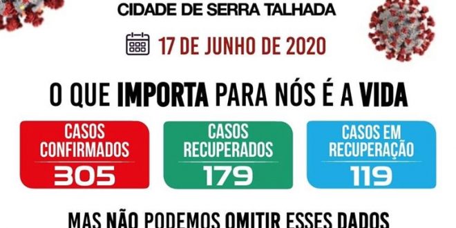 A Secretaria de Saúde de Serra Talhada informa que foram confirmados mais 19 casos positivos de Covid-19 nesta quarta-feira (17), totalizando 305 casos. São sete pacientes do sexo masculino e doze do sexo feminino.