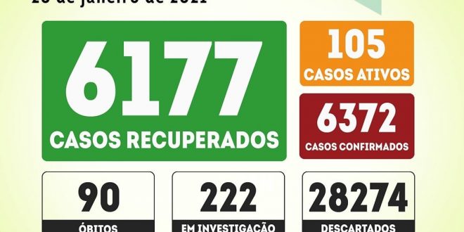 O município tem 222 casos em investigação, 28.274 descartados, 6.372 casos confirmados, 96 pacientes em isolamento domiciliar, 09 pacientes em internamento hospitalar, 105 casos ativos e 90 óbitos.