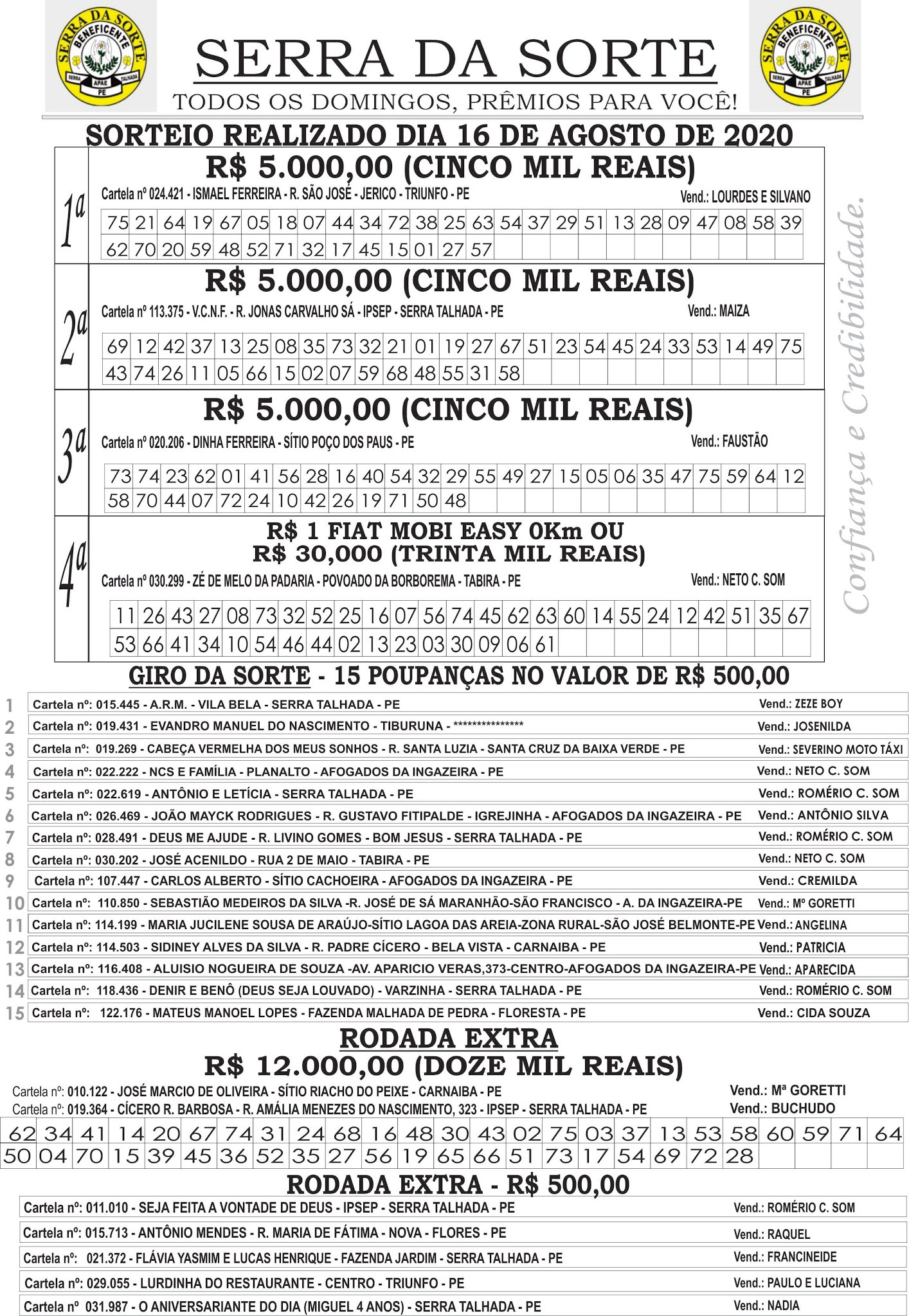 Resultado do Serra da Sorte deste domingo (16) 16 de agosto de 2020 SERRA DA SORTECompartilhar nas Redes