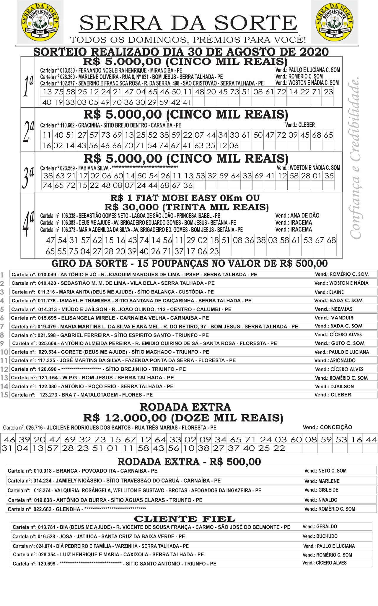 Resultado do Serra da Sorte deste domingo (30) 30 de agosto de 2020 SERRA DA SORTECompartilhar nas Redes